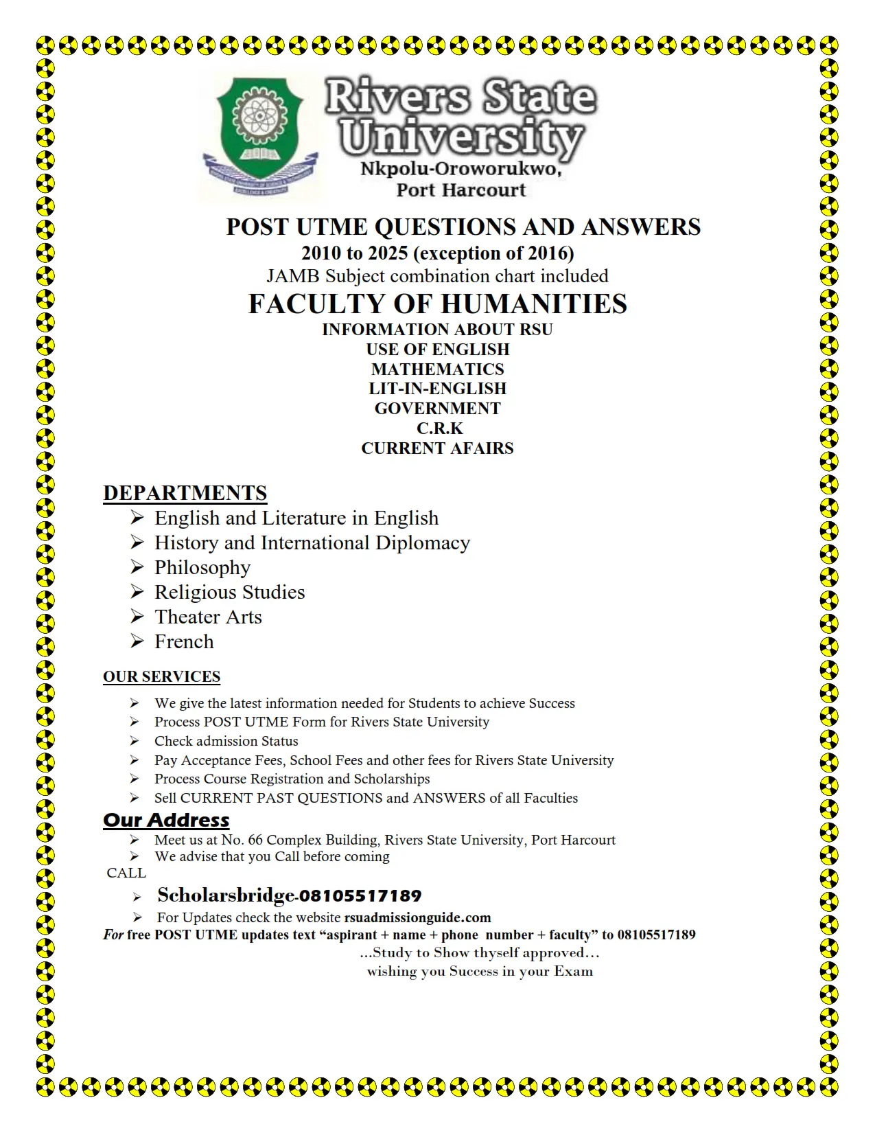 This is the Rivers State University Post UTME Past Questions and Answers for Faculty of Humanities, it covers all the departments as follows: